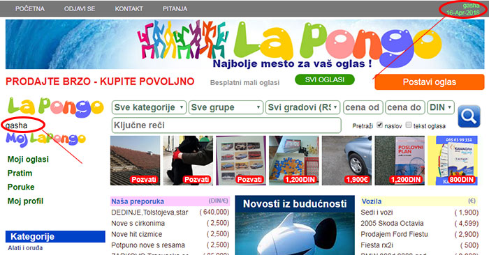 Da bi ste postavili oglas, neophodno je da ste registrovani i ulogovani, što možete da se uverite, u gornjem desnom uglu se prikazuje vaše korisničko ime.