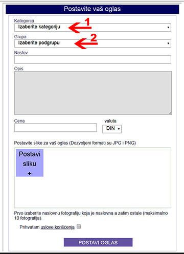 1. U formularu prvo izaberite kategoriju iz padajuće liste (kojoj pripada vaš proizvod ili usluga). Ovo je obavezno polje