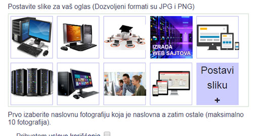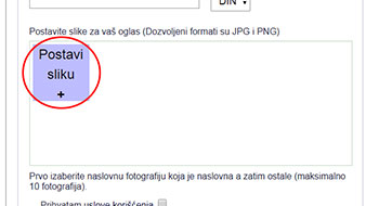 7. Postavite slike vašeg oglasa, kliknite na dugme "Postavi sliku +", otvoriće vam se prozor za izbor slika sa vašeg kompjutera. Prvo izaberite jednu sliku, koja će da bude vidljiva prilikom izbora oglasa, kao naslovna,