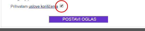 8. Završni korak je da čekirate, kliknete na kvadratić pored teksta "Prihvatam uslove korišćenja", ćime potvrđujete da prihvatate uslove korišćenja sajta "LAPONGO" i kliknete na dugme "POSTAVI OGLAS", tada ste postavili vaš oglas, pojaviće se poruka sa potvrdom da ste sve uradili kako treba i otvoriće se naslovna strana sajta na kojoj možete da vidite vaš oglas u najnovijim oglasima.