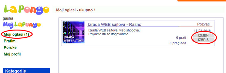 Vaš oglas, podatke u vašem oglasu, Kategoriju, Grupu, Naslov, Opis oglasa, cenu, valutu i slike, možete da izmenite u delu "MOJ LAPONGO", koji se nalazi na levoj strani, tako što izaberete opciju moji oglasi, kliknete na nju i tada će se pojaviti na desnoj strani, svi vaši oglasi.