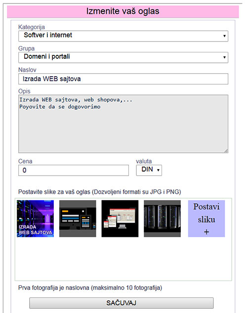 Kada završite sve izmene, kliknite na dugme "SAČUVAJ" i vaš oglas će biti izmenjen.