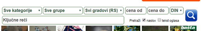 Oglase možete da pretražujete na više načina. Prvo izaberite kategoriju iz padajuće liste a zatim podgrupu, kako bi ste suzili pretragu. Možete da izaberete grad iz kojeg želite da vidite oglase. Odredite raspon cena koji vam odgovara, od do.