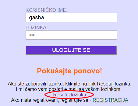 Ako ste zaboravili lozinku, kliknite na dugme "ULOGUJ SE" koje se nalazi na vrhu strane u meniju i pojaviće se dijalog za logovanje, tada u polju "KORISNIČKO IME" upišite vaše KORISNIČKO IME a u polju "LOZINKA:" upišite "123" i kliknite ispod dugmeta "ULOGUJTE SE" na link "Resetuj lozinku" i na vaš email dobićete poruku sa vašom lozinkom.